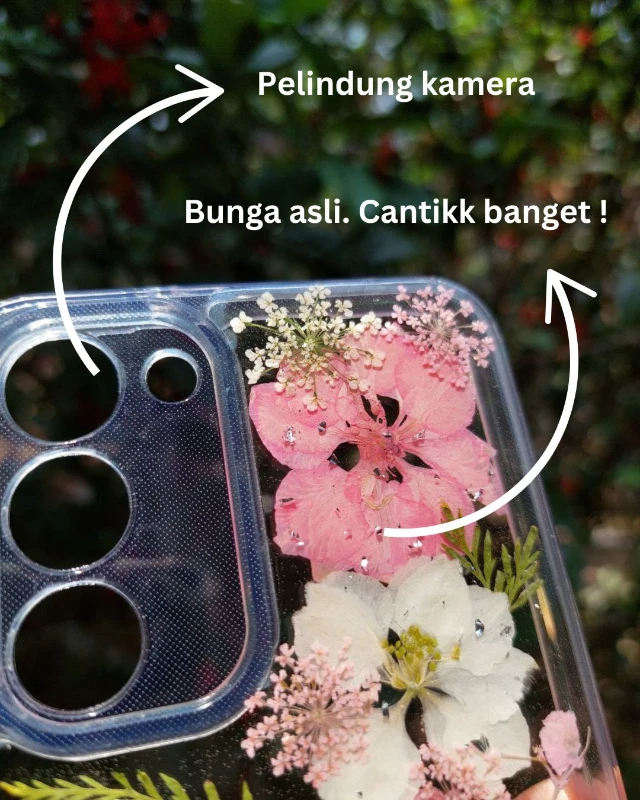 Case HP ini kami hias dengan rangkaian bunga dan daun asli.